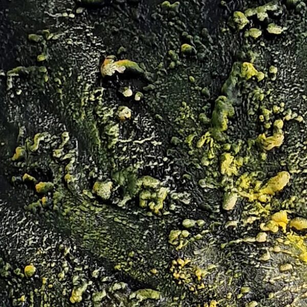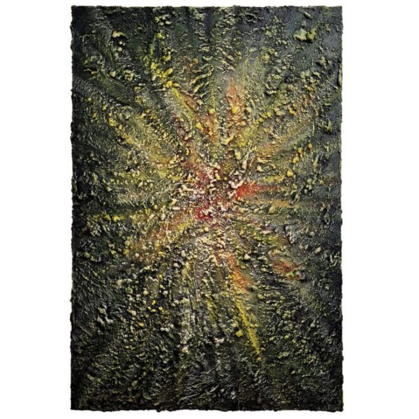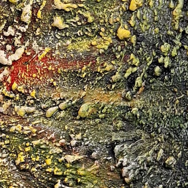 Het oppervlak is rijk en uitgesproken gestructureerd. De verf is in dikke lagen en korrelige clusters aangebracht, wat resulteert in een tactiel, bijna vulkanisch reliëf. De textuur roept associaties op met natuurkrachten, groei, erosie en transformatie. Licht vangt zich in de verheven delen van het oppervlak en accentueert de gelaagdheid en intensiteit van het werk.