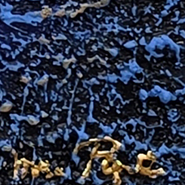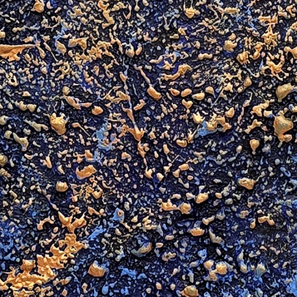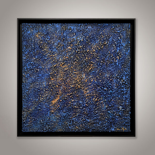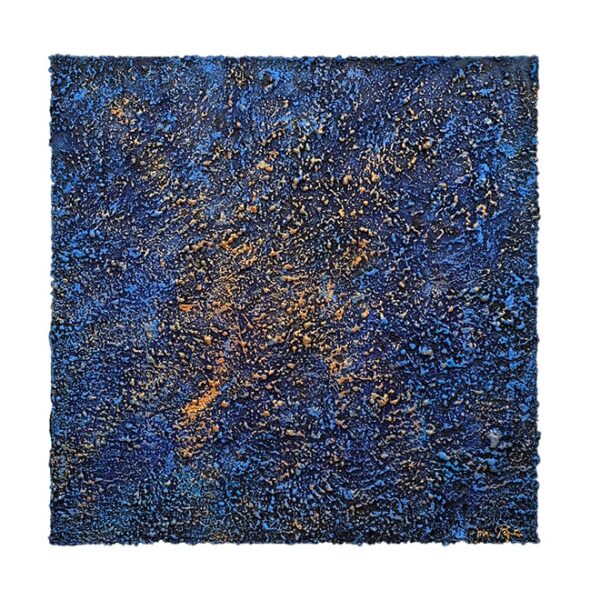 De ruwe, bijna minerale structuur geeft het werk een tastbare diepte en roept associaties op met kosmische landschappen of verweerde aardoppervlakken waarin edelmetalen verborgen liggen. Van dichtbij ontvouwt zich een complex spel van materialen en texturen; vanop afstand ontstaat een krachtige, evenwichtige compositie met een luxueuze uitstraling en sterke visuele impact.